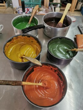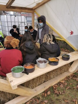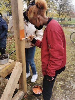 — Test de peinture à l'ocre/farine (novembre) avant le début de l'hiver : chantier participatif avec les habitants (en partenariat avec l'atelier de quartier de l'association Julienne Javel).