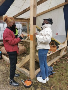 — Peinture à l'ocre/farine : décoration naturelle et multicolore de l'abri des récupérateurs d'eau et des mâts.